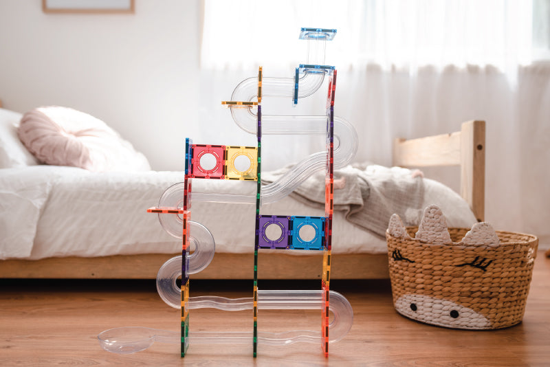 The Connetix 92 Piece ball run set features clear fluted tubes so you can see the balls zoom through, 2 x special effects stair case sound scape pieces, 2 x S bend pieces AND a split tube for racing fun…