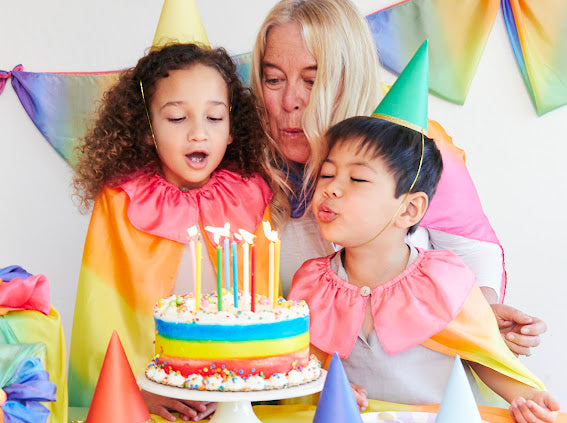 The Rainbow Silk Cape is 32-inches long with an elastic band that comfortably stretches from 18 to 28-inches.