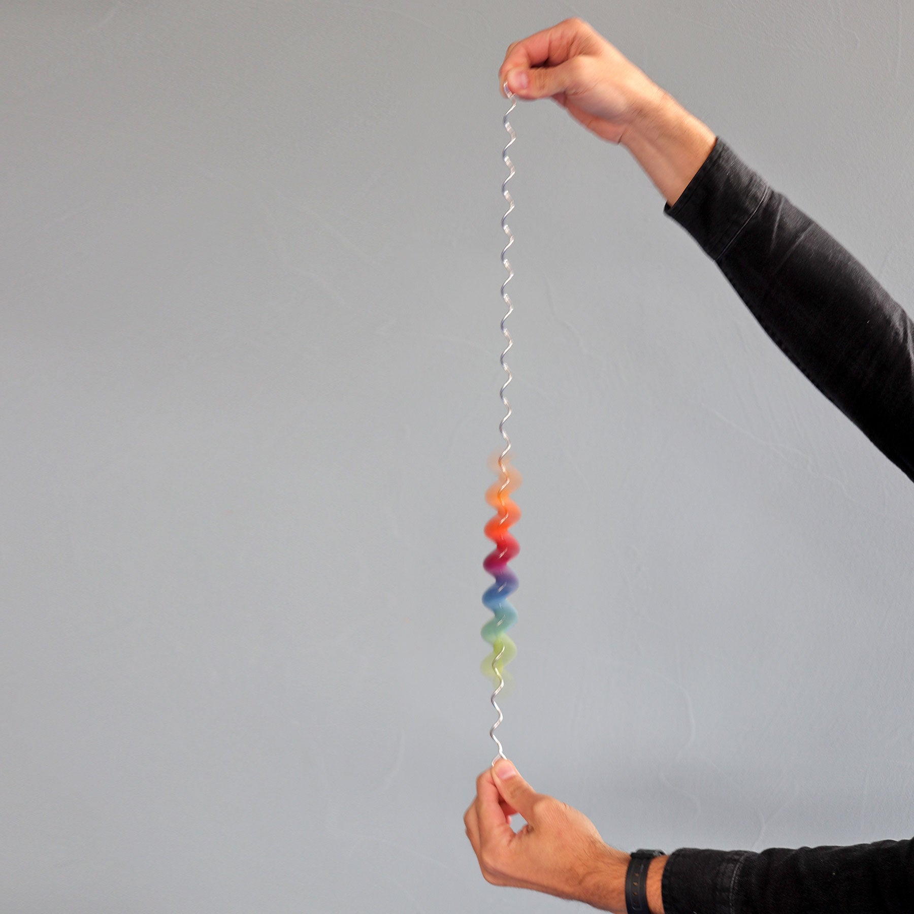 Hold the Spirelli upright, then turn upside down and watch the wooden rings cascade down the spiral wire, making a cool whoosh and ringing sound as they go.
